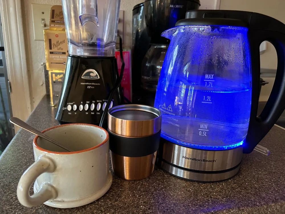 We got here and as in America found that the water is boiled in a kettle on the stove. The kettle we had was difficult to pour from and had a funny taste so we were heating up water in a little pot on the stove. On one of tour trips to Target I found a very small selection of electric jugs. I came out with a 1.7litre for us, and two 1 litres for Linda and for Jane. Best Buy Ever and its even pretty.