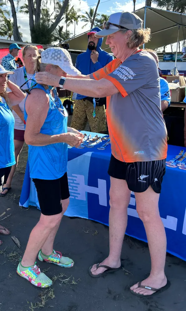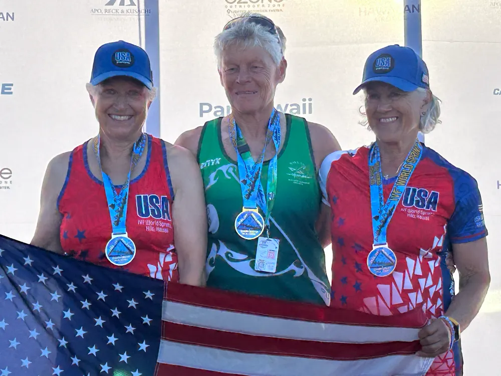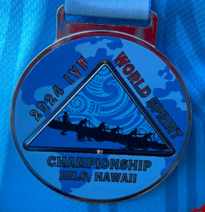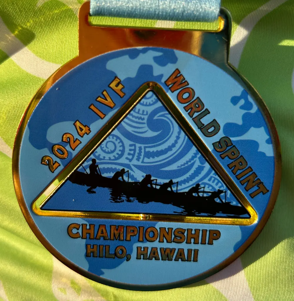 Wow, what an exciting day. Wow, what a long day. But the medal count for paddlers from our area was impressive. The most exciting were the Gold medal for the W12 Master Women 50 and the silver medal W12 Master Women 75. The medals are gorgeous and unusual as the centre triangle rotates.