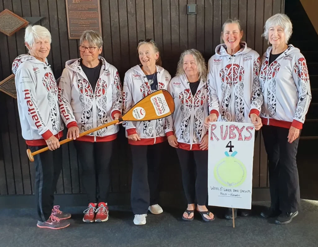 Yesterday we had a plan but that was disrupted by the rain. we ended up doing some exercises at home and were going to go to Ken’s Pancake House for lunch. However, the call came thru’ that they wanted crews to help take the Matahina waka from the Port to the beach. Of course we put our hands up. We raced over. Because we had 2 steerers and 6 paddlers we got to take over 2 waka. It was great to get out on the bay and feel the water which is so different from ours. It meant we didn’t get lunch until 3:30pm when we went to Ken’s Pancake House where the panckes are the size of dinner plates.