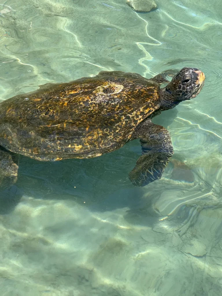 This turtle has a very interesting story. It had a damaged shell so they took it into Honolulu to resin the shell back together and to rehabilitate it. They put a tracker on it and released it in Honolulu. It swam straight back to the Big Island and is a regular visitor to Carl Smith. You can see the resin patch on its back where the shell was damaged.